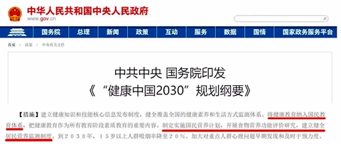 国务院印发《国务院关于实施健康中国行动的意见》,它与2017年国务院发布的《国民营养计划(2017-2030)年》一起,将是指导未来十余年我国营养和合理膳食工作的重要文件。《意见》明确了15个专项行动,国家卫健委就其中“合理膳食专项行动”举行新闻发布会,卫健委食品司副司长张志强介绍,专项行动要求研究制定实施营养师制度,在幼儿园、学校、养老机构、医院等集体供餐单位配备营养专业人才。